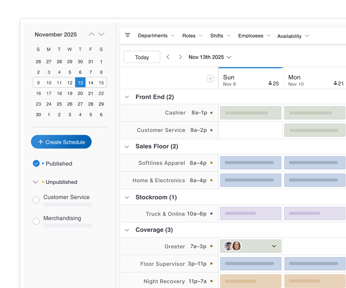 Multi-Department & Location Views: Plan coverage for registers, sales floors, and stockrooms across one or many stores from a single scheduling hub.