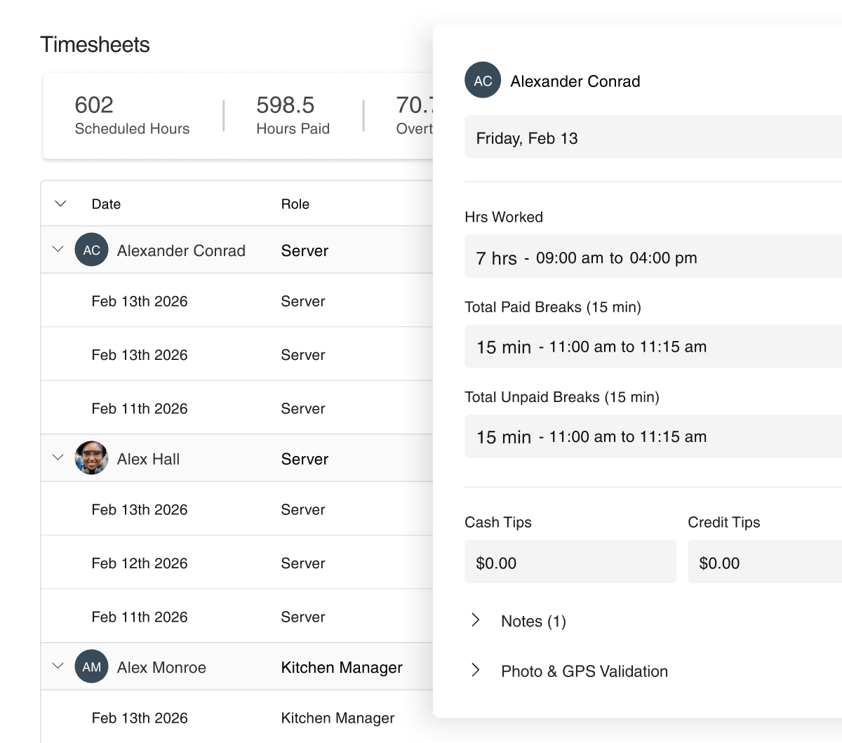 Comprehensive Tip & Wage Management: Track and manage tips and wages directly on timecards, simplifying payroll calculations.